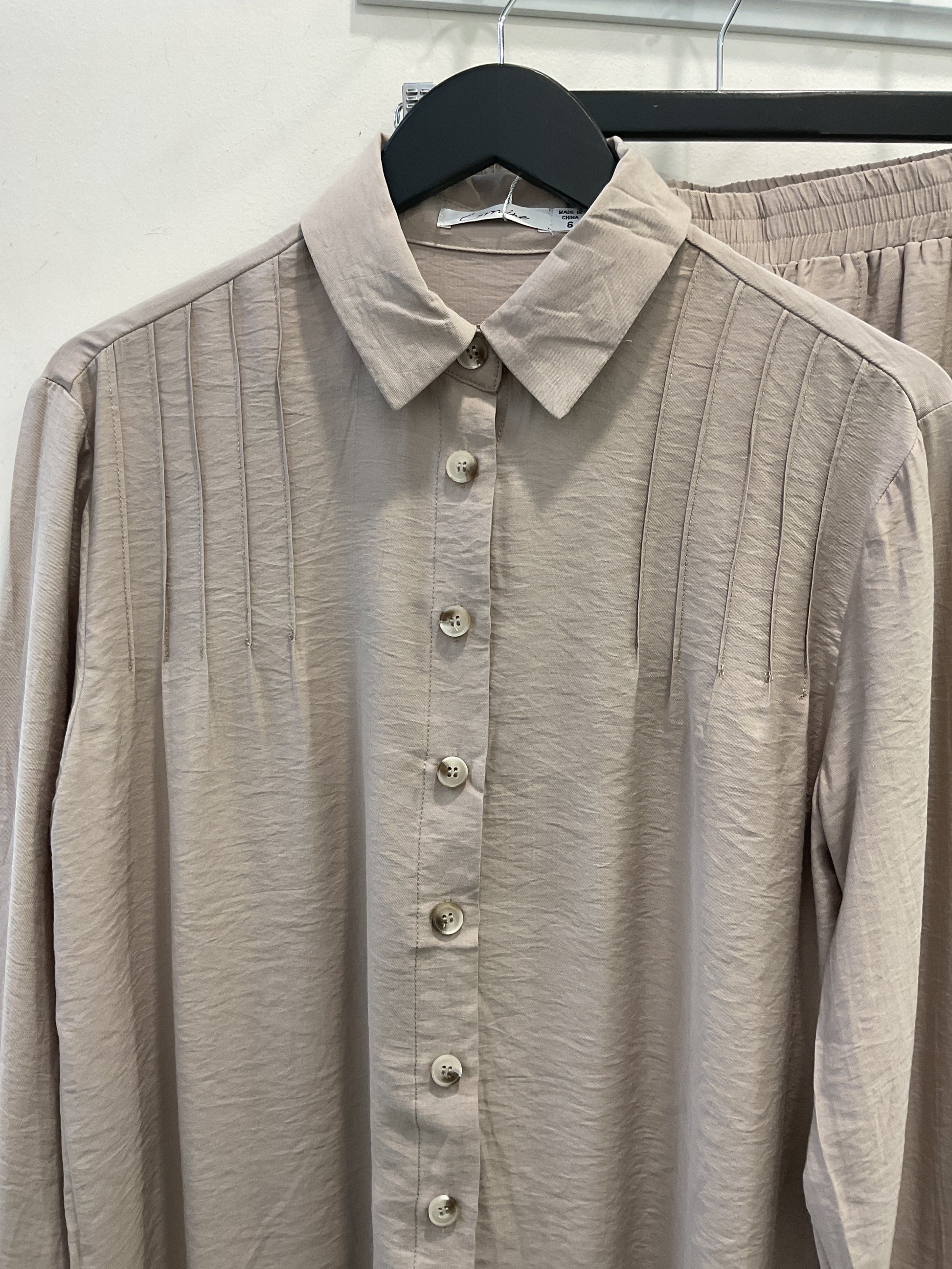 This Beige Flowy set is the perfect summer outfit. Its two piece design features a stylish blouse and pants set featuring convenient pocket detail. Made from comfortable material, it's perfect for staying cool and fashionable on hot days.