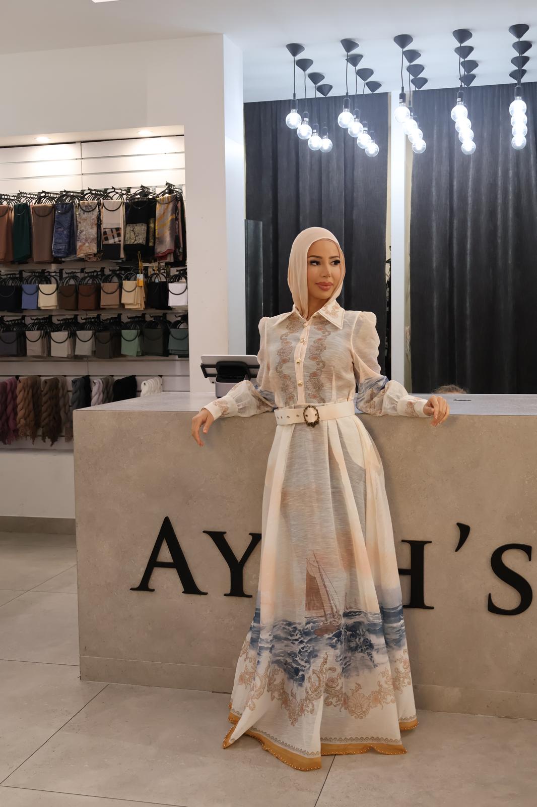 The Joujou dress is crafted in a peach pattern, featuring gold buttons and a coordinating belt. This design balances aesthetic appeal with functionality, allowing for versatile styling options. The quality of the materials ensures comfort, making it suitable for various occasions while maintaining an elegant appearance.