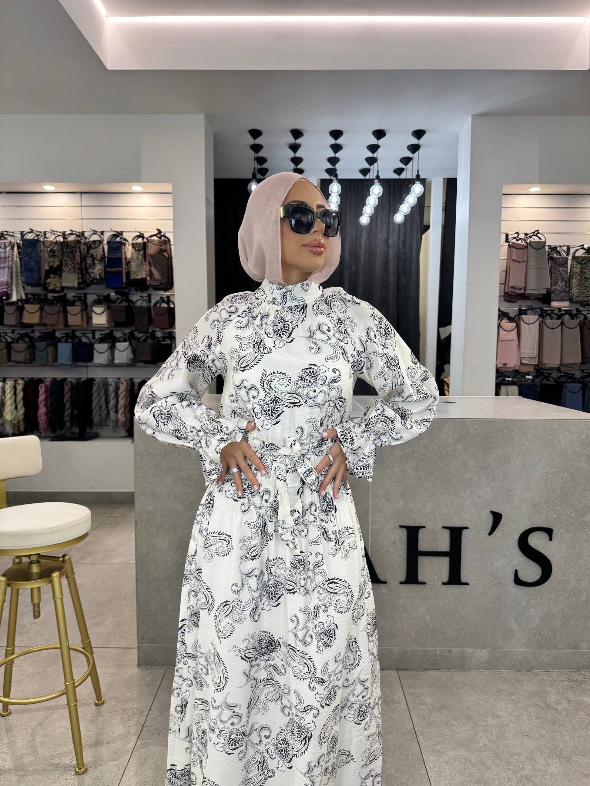 This printed Zarra dress features a classic black and white design with a tie-up waist, creating a flattering and versatile look. Perfect for any occasion, this dress offers a timeless style with modern touches. Dress it up or down for effortless elegance.